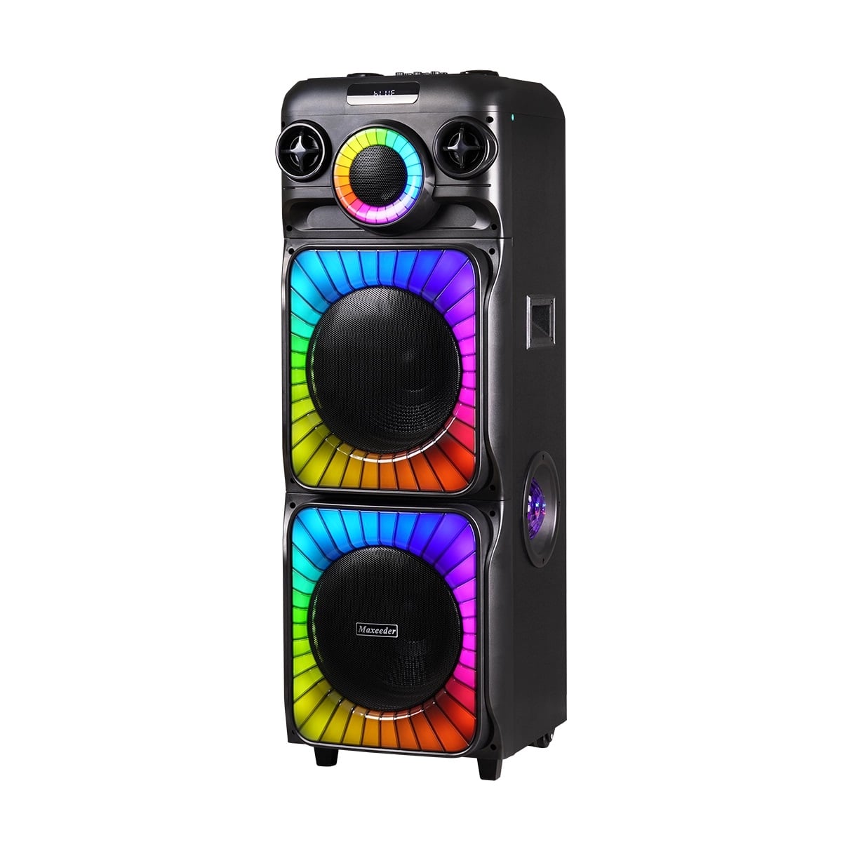 توضیحات اسپیکر دارای چرخ برای حمل آسان-قابلیت TWS-قابلیت اولویت میکروفون (Microphone priority)-کارائوکه -دارای کلید سه حالته (باتری، خاموش، برق شهر)-دارای رقص نور چرخشی RGB دور سابها 2 نور جانبی Light Ball- دارای ورودی 12 ولت 7 آمپر به صورت مجزا-ورودی گیتار برقی-دارای دو ساب 12 اینچ و تیوتر-قابل حمل-نمایش حالت باتری-دارای بیس و تریبل و اکولایزر-دارای اکو و ولوم میکروفون