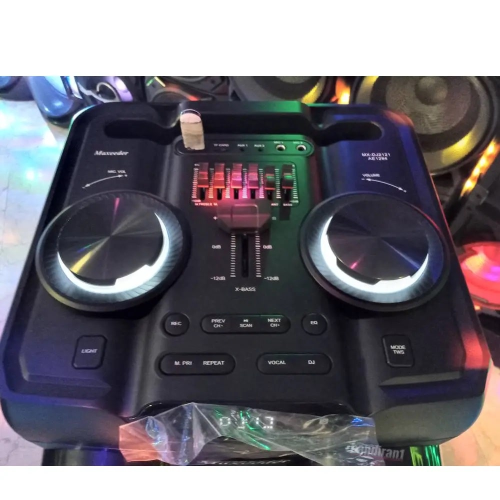 اسپیکر قابل حمل و شارژی مکسیدر مدل AE-1294 دارای ورودی ۱۲ ولت ۷ آمپر به صورت مجزا نیز میباشد. ۴ نوع افکت دیجی صدایی باب میل خود خواهید ساخت. این پخش کننده دارای سیستم اکولایزر برای تنظیم صدای مورد علاقه خود و بالا و پایین کردن تریبل و بیس باند ها میباشد.