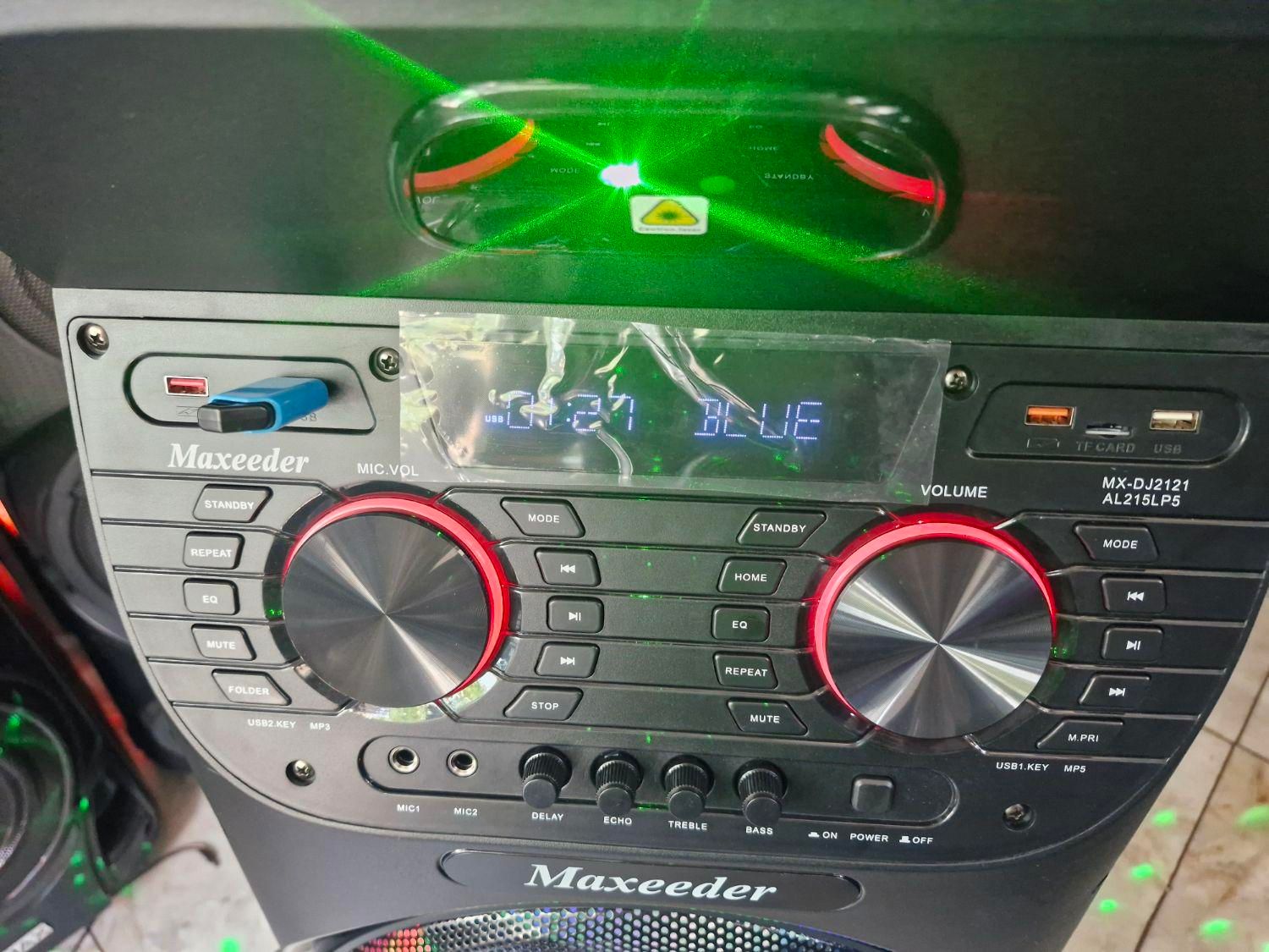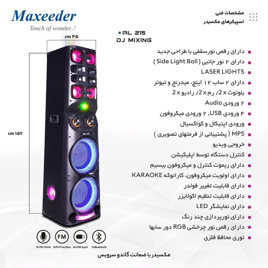 اسپیکر مکسیدر مدل AL-215 یکی از محصولات حرفهای شرکت Maxeeder است که برای پخش صوتی و تصویری طراحی شده است. این اسپیکر دارای ویژگیهایی مانند سابووفر ۱۲ اینچی، تیوتر، میدرنج، رقص نور RGB، و ورودیهای متنوع (AUX، Bluetooth، SD Card، USB و Optic) است. همچنین دارای میکروفن بیسیم و قابلیت کارائوکه با حذف صدای خواننده است.