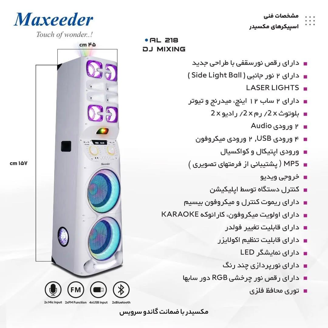 اسپیکر دیجی مکسیدر مدل AL-218 LP5 نسل جدید باند ایستاده است که به رنگ سفید عرضه شده است. این محصول به صورت جفت هم عرضه شده است که با مدل AL-276 LP5 شناخته میشود. مدل ۲۱۸ دارای دیجی است که تنظیمات بسیار حرفه ای تری را در اختیار شما میگذارد. طراحی فوق العاده حرفه ای این اسپیکر نمایی بسیار زیبا را به منزل شما میبخشد. طراحی مورب و بلندی دارد و هر کجای محیط باشد به زیبایی خواهد درخشید. اگر به دنبال یک اسپیکر فوق پیش رفته با طراحی و صدای بسیار خوب هستید میتوانید مدل ۲۱۸ را در لیست خرید پخش کننده خانگی خود قرار دهید.