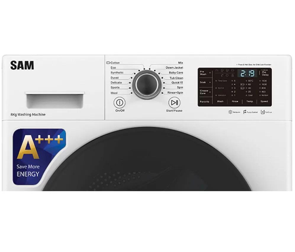 شرکت سازنده لباسشویی سام ، برنامه ای با عنوان “پیش شستشو” در این محصول طراحی نموده است که عملکرد آن به این صورت می باشد که قبل از مرحله اصلی و برای مدت زمان کوتاهی لباس ها را شستشو داده تا از بار آلودگی آنها بکاهد و آماده مرحله اصلی شوند. این برنامه در موقعیت هایی که حجم زیادی از لباس کثیف برای شستشو وجود دارد، بسیار کاربردی می باشد. در مواقعی که یک یا تعدادی لباس از شستشو جا بماند، شما می توانید با فعال نمودن گزینه مربوطه، توقف کوتاهی در فعالیت دستگاه ایجاد کرده و لباس ها را به دیگ اضافه نمایید. پس از آن، لباسشویی به ادامه شستشوی خود می پردازد.